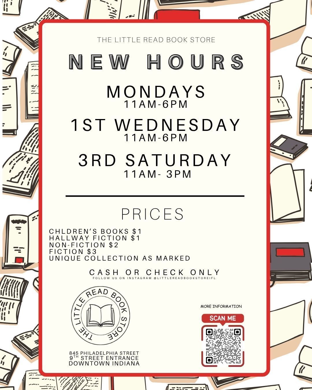 The Little Read Bookstore is part of the Indiana Free Library but has a separate entrance. It is run by library volunteers who typically complete two-hour shifts. All books are donated or weeded from our own collection. Our books are affordable and we hope you enjoy the shop. There is special merchandise handmade and donated from many community members, there are t-shirt's, sweatshirts, canvas bags, hand sewn book bags, knitted and crocheted items, and other amazing little gift items. We now sell Dan Smith's chocolates as well. So, what are you waiting for, come on in and find a treasure to take home today. Every Monday and third Saturday of the month, we are open for your business. Our Merchandise is the very best, almost as amazing as the volunteers that make this work. All proceeds for the first year of operation will go towards a new copier for our community at large at the Indiana Free Library.
