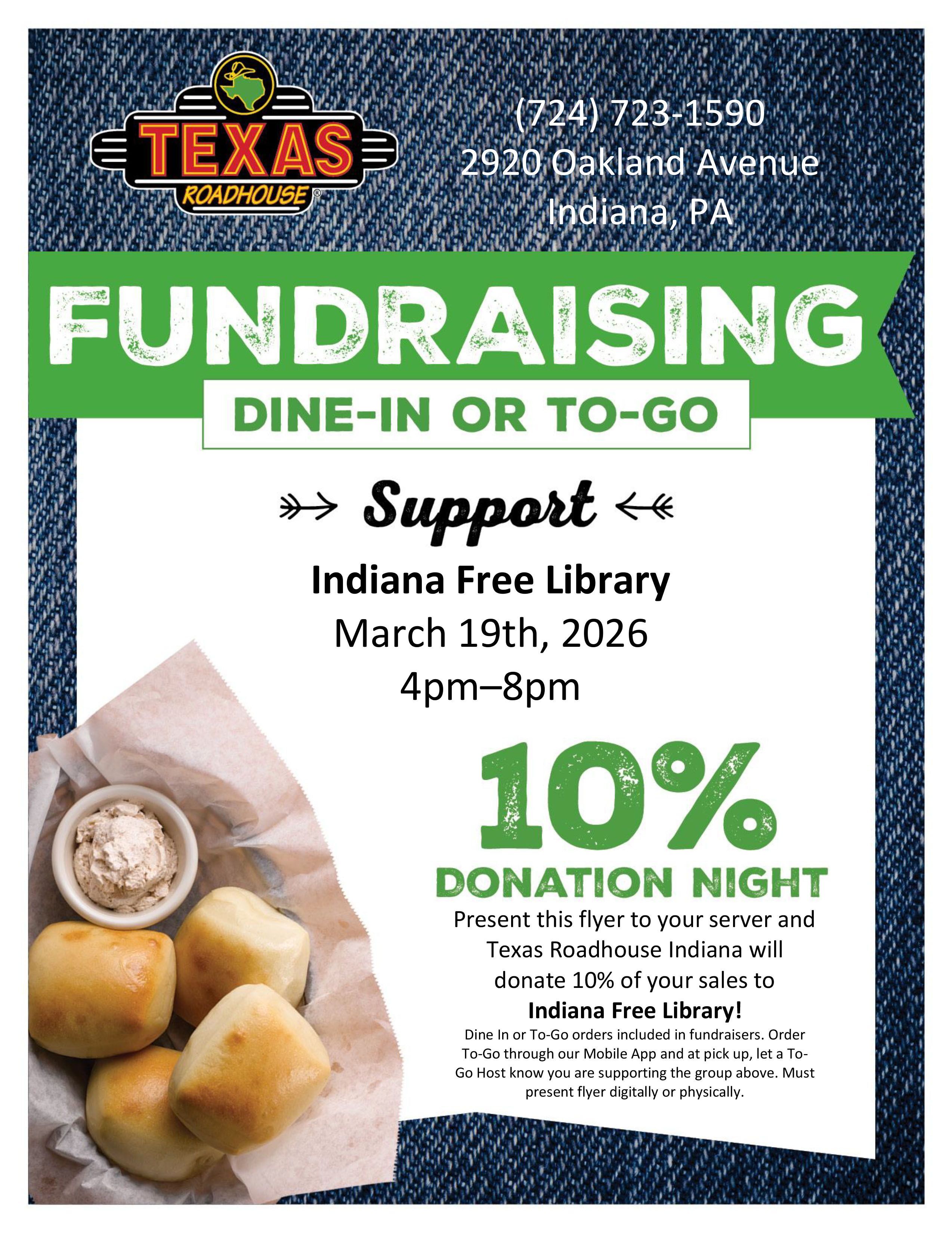 Join us for a Dine & Donate Night at Texas Roadhouse on Thursday, March 19 from 4โ8 PM. When you present the event flyer, 10% of your purchase will be donated to the Indiana Free Library.