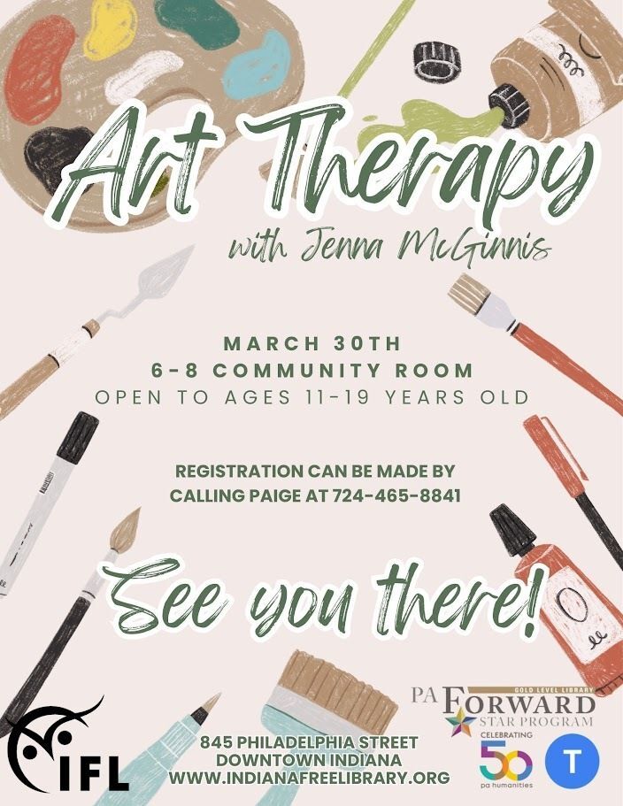 Join us for an evening of Art Therapy with Jenna McGinnis. Please call to register for the event so that we have enough supplies.